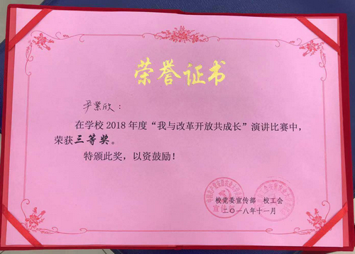 我园尹紫昕老师代表机关三总支参加的比赛,她和其他选手们紧紧围绕“波澜壮阔40年 我与改革共成长”的主题,畅谈改革开放40年来中国的巨变,抒发了致力于中国特色社会主义新征程的满怀激情,展现了新时代幼教工作者的敢于拼搏、奋发有为的精神面貌,引导大家在新时代到来的这一历史契机,投身于社会主义的建设当中,在全面建成小康社会到来的决胜期做出贡献,为实现中华民族的伟大复兴奉献自己的力量。经过激烈角逐,尹紫昕老师取得了三等奖的优异成绩。