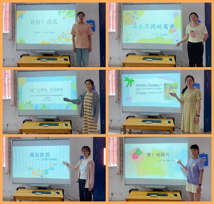 《嗨,鸭蛋》、《萝卜嗨翻天》、《遇见秋葵》、《你好,丝瓜》、《“瓜”趣横生》、《与众不同的莴笋》、《“植”此青绿,乐享耕种》、《花生的奇妙世界》、《你好,蚕宝宝》,第二教研组的老师们围绕幼儿园开展的种植、养殖活动展开了一个个有趣的故事。第一教研组以《再见,幼儿园》、《走进小学》、《与“时间”的奇妙邂逅》、《与尺有约》、《磁铁的秘密》、《百变纸杯,乐趣无穷》、《幼儿园里的小花园》、《小尾巴,大乐趣》、《鸭蛋的探“咸”之旅》为主题,一起走进幼儿园的课程故事里,去发现其中的温暖,美好与成长后期,我们会在幼儿园网站—活动写真栏目中展示老师们的课程故事。