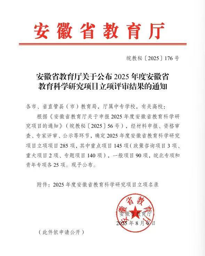喜讯传来!在2025年度安徽省教育厅教育科研课题评审中,安徽农业大学幼儿园凭借扎实的研究基础与创新实践举措,成功立项安徽省教育科学研究项目,在教科研领域再获新突破、再创好成绩。