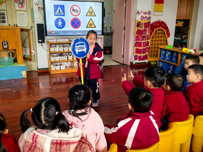 接下来,结合幼儿认知特点,交警叔叔用通道俗易懂的语言、形象生动的比喻,围绕过马礼仪、交通信号灯识别、乘车安全规范、常见交通标志含义等内容展开讲解,将交通规则转化为孩子们容易理解的生活常识。在最受期待的有奖竞答环节,交警叔叔抛出精心设计的问题,“ 过马路要走什么地?”“ 动车,要戴什么保护头部?电动车可以几人骑行 .....孩子们积极举手、踊跃抢答,现场氛围热烈高涨。每当有小朋友答对问题,叔叔便及时送上玩具小警车、反光小徽章等精美奖品,以鼓励孩子们主动学习、牢记知识,在轻松愉悦的互动中,将交通安全知识牢牢印在脑海里。