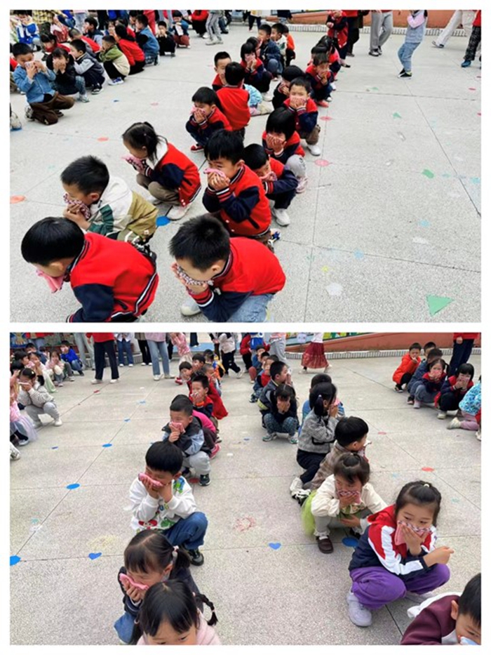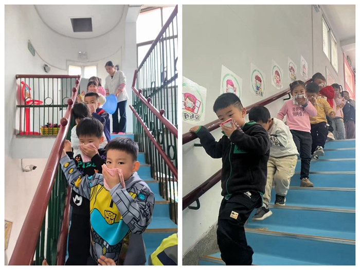 10:30分,随着急促的警报声响起,班级教师组织幼儿用毛巾捂住口鼻、弯着腰,秩序井然的按照预定的疏散路线迅速撤离到操场。