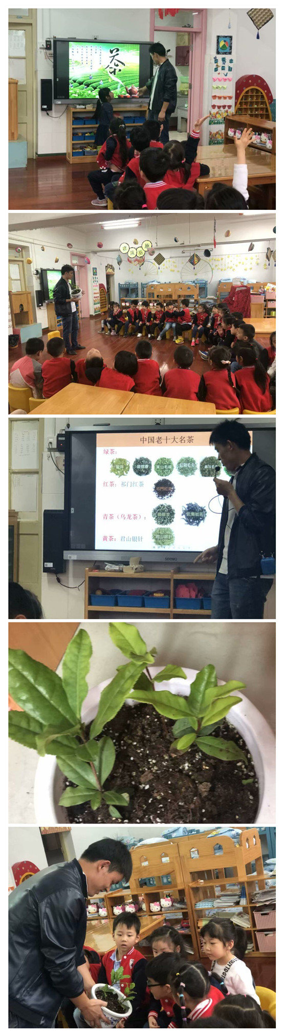 作为茶叶系的教授,刘奕萱小朋友的爸爸看到幼儿园为孩子们设计的关于茶文化的教育,他也按捺不住想要走进课堂来亲自向小朋友做更加专业的茶文化知识的普及。为了能更直观形象地向小朋友做展示他还特地带来一盆茶树带孩子认识,用精心制作的课件以故事的形式向孩子讲解茶文化的来源以及茶叶的种类,耐心地解答孩子提出的各种稀奇古怪的问题。