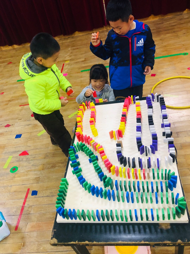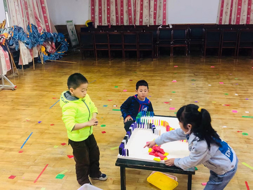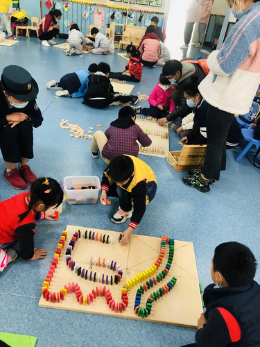 到达预定的时间后,教师离场,比赛正式开始,小选手们知道目标后立刻开始商量分工,在比赛中积极动脑,时而屏气凝神,时而相互交流,都用稚嫩的小手认真搭建着多米诺骨牌,动作快的摆好自己的路线后还进行了检查,充分展现了团结合作的风采。