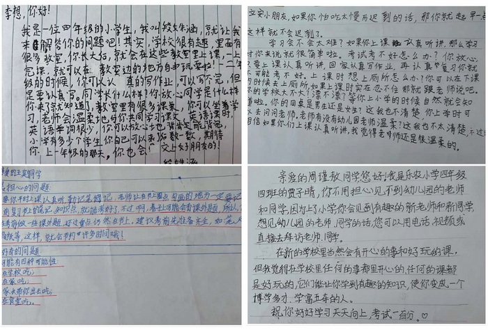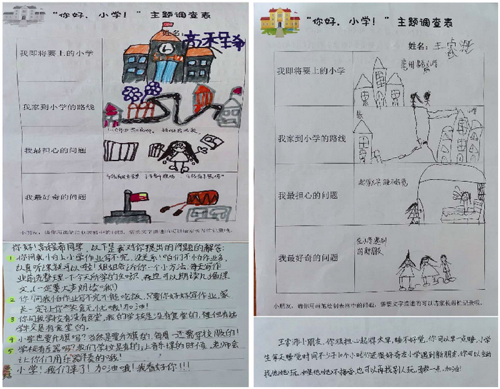 小学有没有滑滑梯啊?小学老师会不会很凶?作业很多,写不完怎么办?我会不会被小朋友欺负呢……对于即将成为小学生的大班小朋友们来说,一谈到小学的话题就滔滔不绝。这不,我们心里的小小疑惑,竟然收到了来自小学里的哥哥姐姐们热心解答,他们认真的字迹和鼓励的话语让我们对小学不那么害怕和紧张,反倒开始期待我的小学生活了呢,希望我也能向这些哥哥姐姐一样优秀!