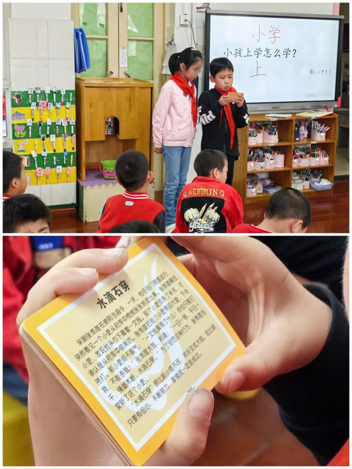 一位哥哥还给我们分享了几个成语故事“水滴石穿”“拔苗助长”“亡羊补牢”…鼓励我们上小学后要努力学习,只要功夫深,铁杵磨成针!