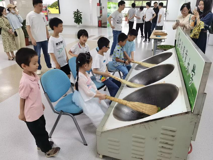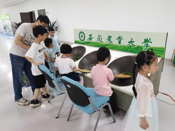 识制茶。安农大农学院专业教师为孩子们现场演绎手工制茶,从鲜叶,萎凋,杀青,揉捻、干燥到成茶进行全过程展示,孩子们在安全距离内感受铁锅温度,近距离从颜色、香气,形状感知茶叶变化,激发了孩子们浓重的好奇心,现场气氛活泼温馨。