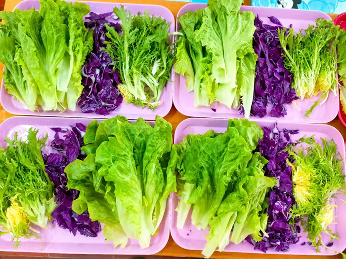 活动开始前,老师精心准备了生菜、紫甘蓝和苦菊等新鲜蔬菜,并逐一进行了仔细的清洗,确保食品安全卫生。随后,老师向小朋友们展示了制作沙拉的详细步骤,从撕菜到搭配、调味,每一个细节都讲解得生动有趣。