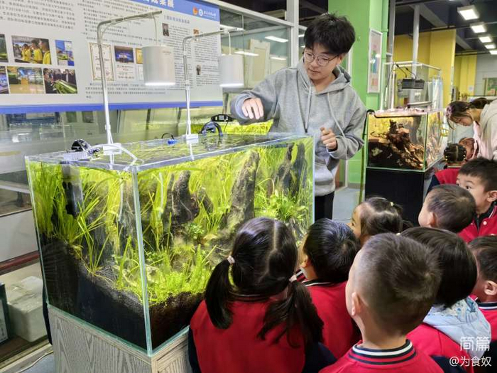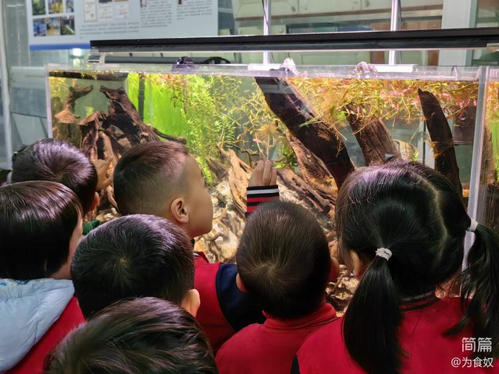 瞧!小朋友们正在听大学生哥哥介绍小金鱼的特点习性以及如何用了哪些材料布置水族箱。哇!小朋友们都听得好认真,好仔细呀!