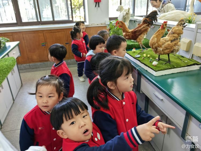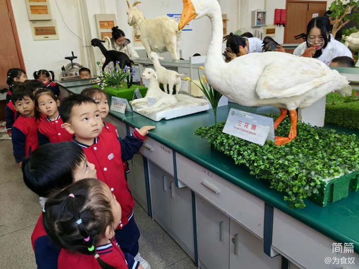 这里摆放了许许多多的动物标本,有小朋友比较熟悉的小鸡、大白鹅、山羊……也有小朋友们不认识的鸽子、黑山羊、黄山羊……小朋友们看到这些动物标本,就像发现新大陆一样,好奇极了!一边走近观察动物标本,一边听大学生姐姐讲解动物的特点、习性。