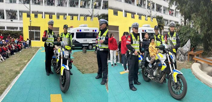 “快看!快看!交警叔叔真帅!摩托车真有型!他们太飒啦!”“哇,我长大了也要骑摩托车!”在孩子们的欢呼中,铁骑队员们骑着摩托车“花式”现身,引擎轰鸣、警灯闪烁,飒爽英姿,炫酷装备,瞬间嗨爆全场。交警叔叔让孩子们近距离观看了铁骑摩托车构造,并现场让孩子们亲身体验。孩子们在交警和老师的帮助下,坐上铁骑摩托车,体验了一把当“小铁骑”的感觉。