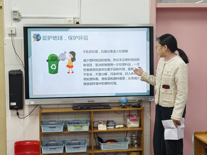 在课程的最后,王老师教育小朋友们爱护地球我们可以做些什么:1.不乱扔垃圾,垃圾分类丢入垃圾桶,减少塑料制品的使用。2.节约用水。3.节约用电。4.外出步行或选择乘公交。5.节约粮食,不浪费。