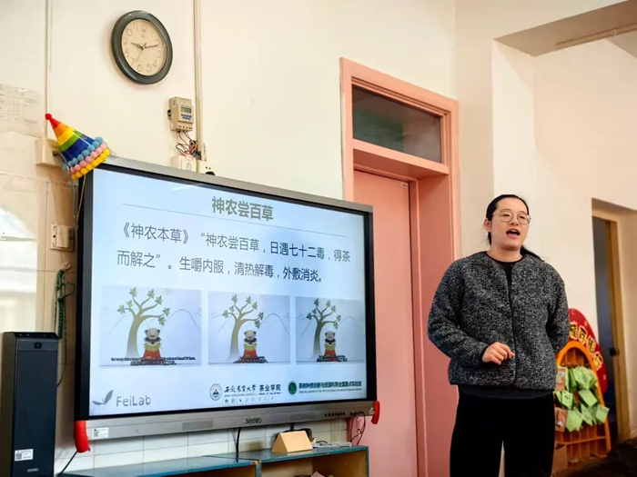 “神农尝百草,日遇七十二毒,得茶而解之……”何奕飞妈妈从古老传说入手,用生动的语言为孩子们讲述茶的起源。孩子们听得入神,仿佛穿越回三千年前的中国。接着,她介绍了丰富多彩的茶叶种类,从绿茶、红茶到乌龙茶,还特别提到了我们本地的舒城916茶园和舒茶早品种,让孩子们了解到茶不仅好喝,还有不同的“家乡”和“名字”。