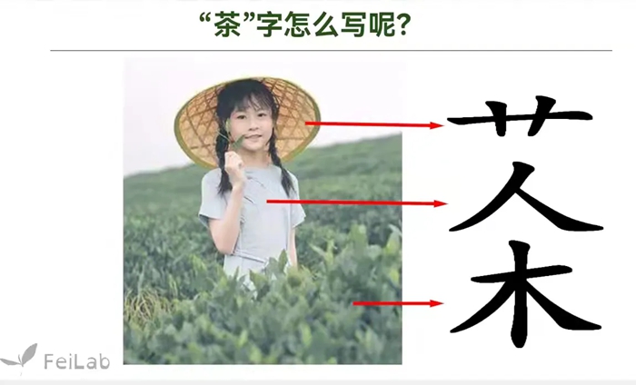 认识了茶叶本身,一个汉字的神秘面纱也被揭开——“字怎么写? 何奕飞妈妈引导孩子们仔细观察:上面是草,下面是木,中间藏着一个小人儿!当孩子们发现字就是人在草木间时,都感到惊奇不已。这个美丽的汉字,仿佛在说:喝茶的人,正惬意地置身于大自然之中。