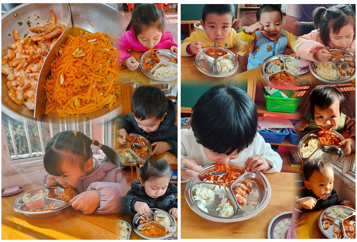 午餐刚好是胡萝卜炒香干,小朋友们吃得可开心了,纷纷表示要全部吃光光~