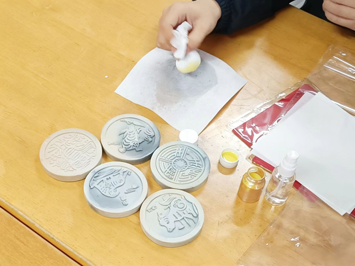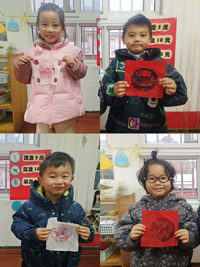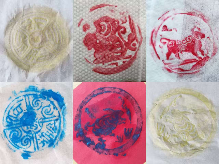 随着拓包一次次轻拍,纸张上逐渐浮现出清晰的图案——有的是吉祥纹样,有的是生肖。孩子们兴奋地举起自己的作品,互相展示、分享喜悦。孙璟玥爸爸和志愿者们还为大家讲述了图案背后的文化小故事,让拓印不仅是手工,更是一次穿越时空的文化对话。