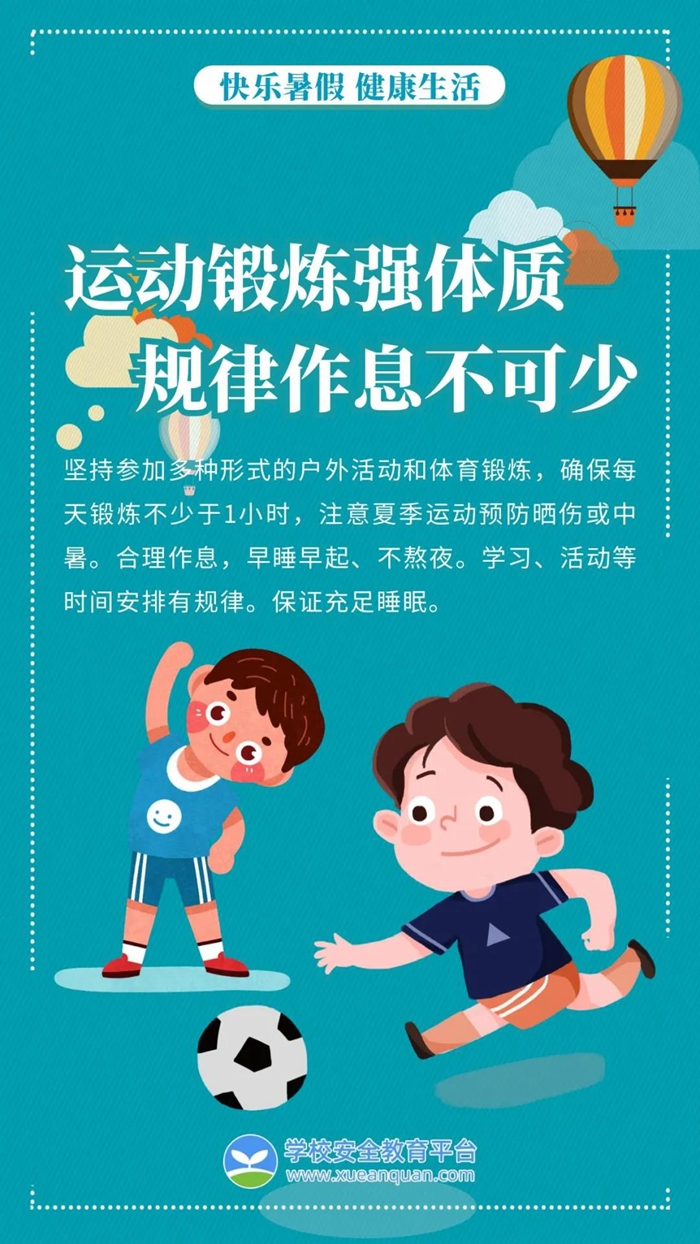 近日,教育部指导全国中小学健康教育教学指导委员会专家,提出2021年暑期中小学生和幼儿健康生活提示要诀,引导中小学生和幼儿合理安排假期生活和学习,加强体育锻炼,保持健康生活方式。