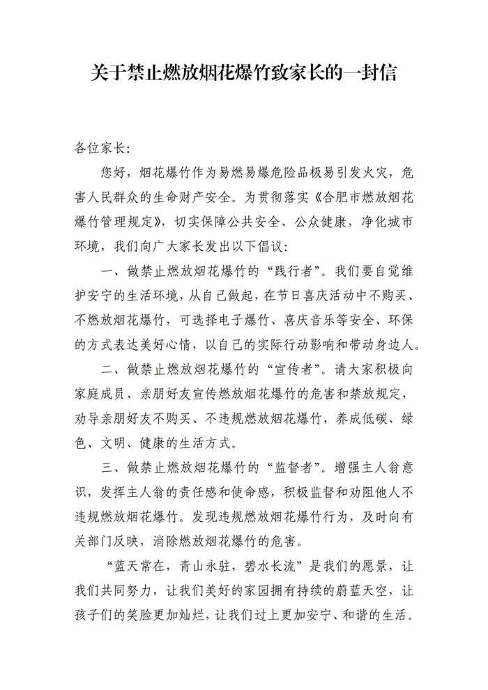 关于禁止燃放烟花爆竹致家长的一封信