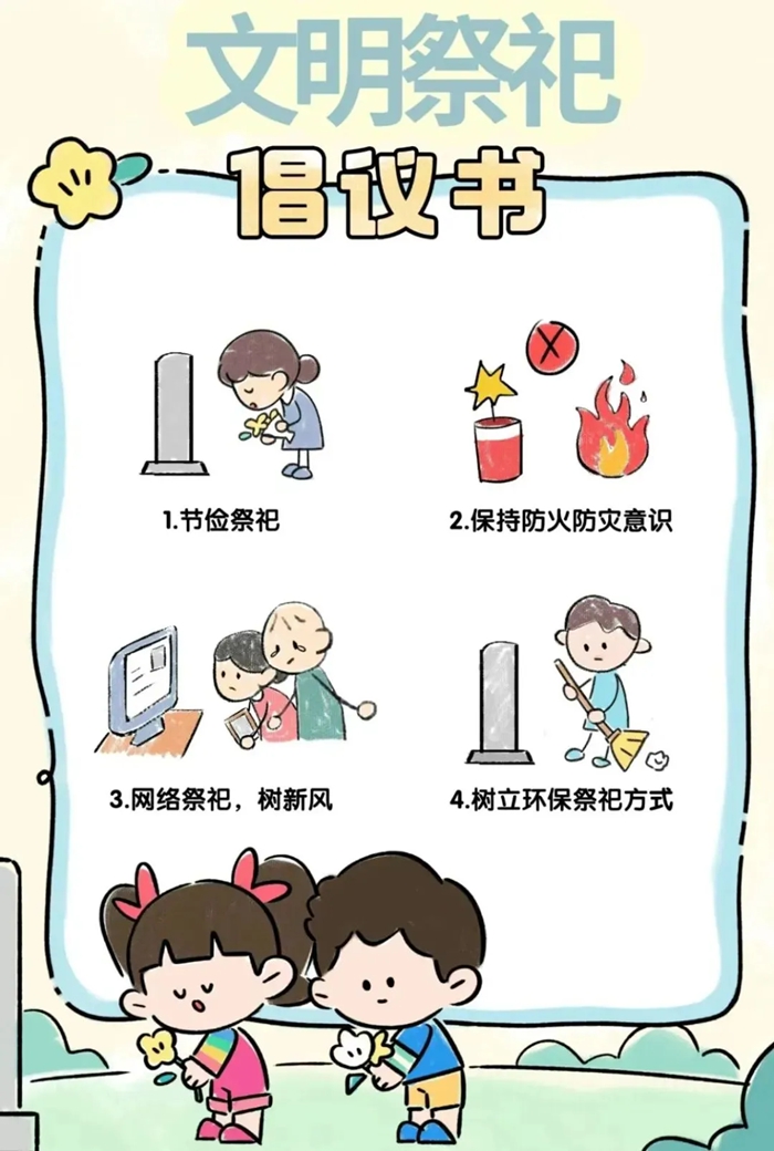 教育孩子不玩火,不随意点燃明火。带孩子祭祀时,遵守各地禁燃放规定,不在山林中点燃明火、燃放爆竹、乱扔烟头,祭扫结束确保火种熄灭。倡导采用敬献鲜花、网上祭祀等文明绿色方式寄托哀思。