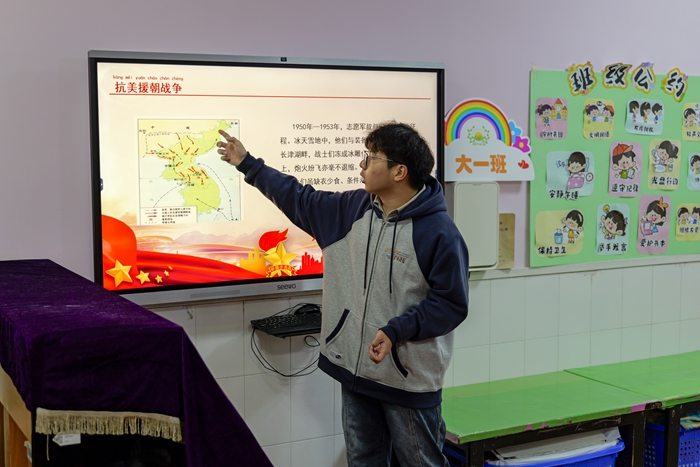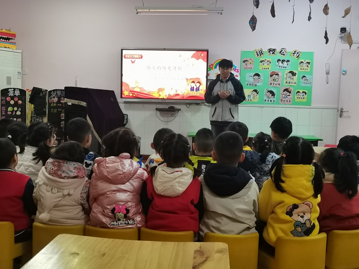 为传承红色基因,弘扬时代主题旋律,厚植爱党、爱国情怀,11月25日,生命科学学院的大学生志愿者来到大一班,在前期采访抗美援朝的老红军的基础上,借着生动的图片和精彩的视频,带领孩子们回顾了一段伟大的历史进程——渡江战役和抗美援朝。