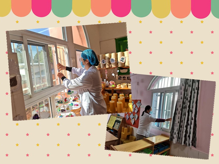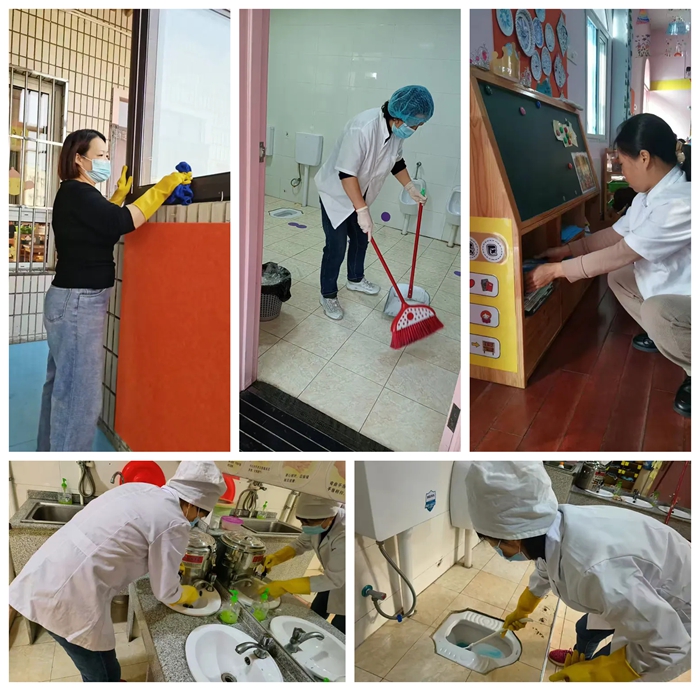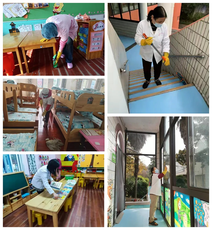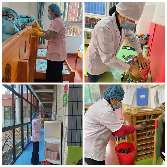 清洁消毒:保育老师会对教室进行彻底的清洁和消毒,包括地面、桌面、窗台门把手、床围栏等孩子们可能接触到的每一个角落。们会使用专用的清洁剂和消毒液,确保环境的卫生。