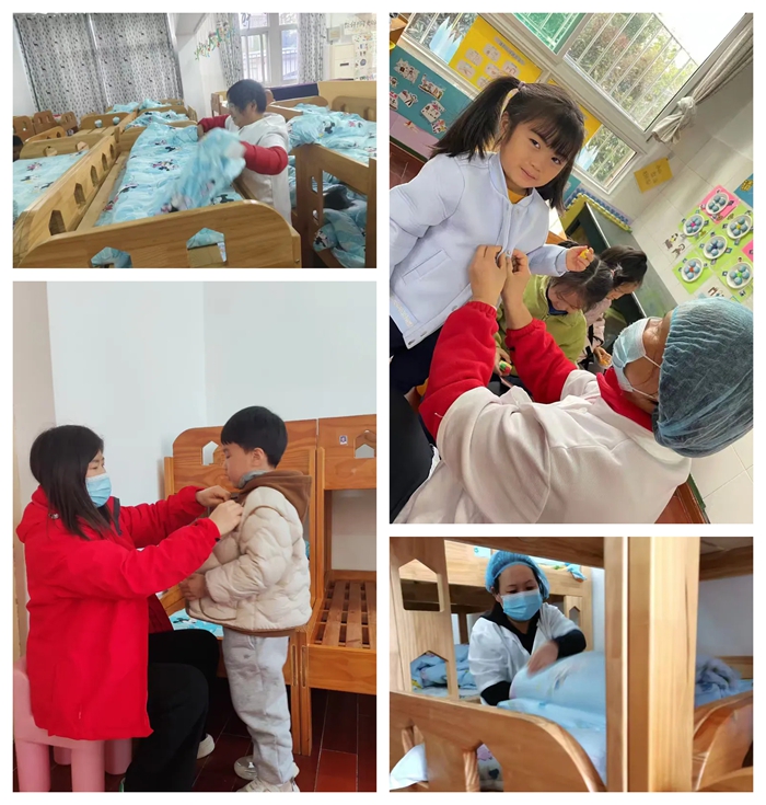 午睡时间,保育老师会指导幼儿叠放衣物孩子们盖被,注意孩子们的睡姿避免发生安全事故。在起床后保育老师为孩子们整理床铺,穿衣,梳头,准备午点……