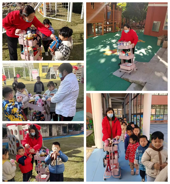 保育老师们会根据天气状况指导孩子们喝温热的水,为了确保孩子们的饮水量达到标准们会在户外活动时推着保育小车,保育小车就像一个百宝箱,孩子们可以随时喝到温热的水、还有纸巾、防虫药……