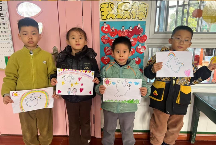 苦难虽已过去,和平来之不易。小朋友们拿起画笔,用心绘画五星红旗和和平鸽,从心灵深处去怀念遇难同胞,希望世界永远美好