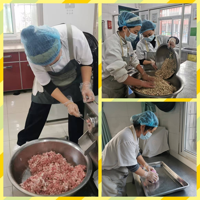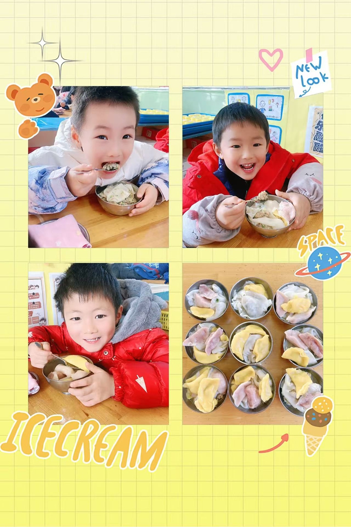 清晨,食堂人员早早来到食堂,蒸南瓜榨火龙果汁和面,准备饺子馅。八点钟刚过各班的奶奶们陆续来到音乐厅,戴好口罩和帽子,做好卫生准备,立刻干起活来,有的擀饺皮,有的包饺子,不一会一个个彩色水饺盛满餐盘!下水饺,孩子们吃着热气腾腾的饺子,十分开心!