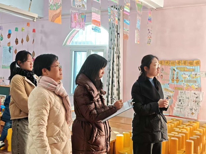 本次活动,邀请了蜀山区教体局教研室专职幼教教研员唐金华老师走进班级,聆听各班级老师对本班环境创设的讲解及创设的意义。每到一处,唐老师都认真观察细节,并从主题墙游戏区其它区域三个方面进行观摩评分。