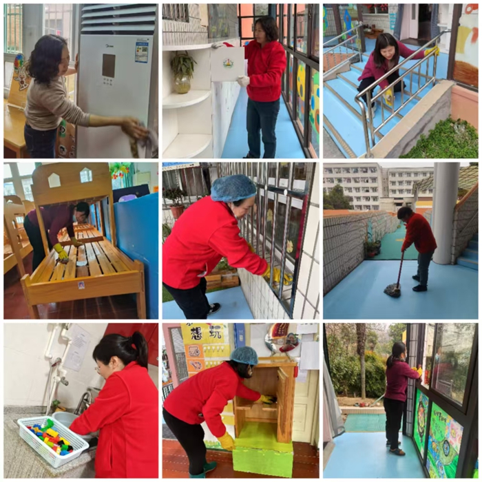 开始,从"着手,保育老师们认真打扫门前、楼道、走廊等公共学习游玩区域,户外大型玩具进行清洁消毒工作。从教室的每一个角落,到孩子们日常接触的每一件物品,保育员们都认真对待。她们拿着抹布,仔细擦拭窗台,不放过任何一处灰尘;扫帚在地面舞动,将纸屑杂物清扫干净;桌椅被反复擦洗,确保表面洁净;玩具、餐具等物品严格按照消毒流程处理,杜绝病菌残留;厕所也进行了深度冲洗和消毒,经过保育员们的精心呵护,整个教室焕然一新,为孩子们提供了一个更加健康、安全、舒适的学习环境。