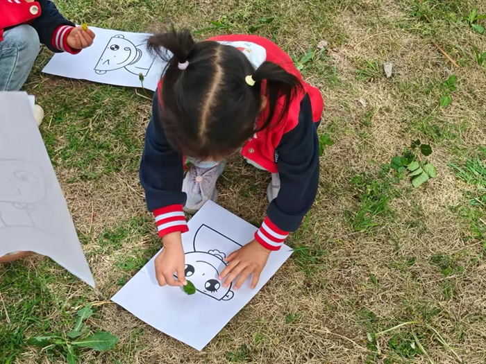 小二班的小朋友们来到校园里的小树林。一走进树林,就像闯进了一个绿色的童话世界。阳光透过树叶的缝隙,洒下细碎的光影,像是大自然洒下的金色糖果。孩子们欢呼着、雀跃着,小小的身影在树林间穿梭。他们的眼睛里闪烁着好奇的光芒,迫不及待地想要和这片树林来一场亲密接触。很快,孩子们就被地上形态各异的树叶吸引住了。他们弯下腰,小心翼翼地捡起一片片树叶,黄的、绿的,每一片都像是大自然精心创作的艺术品。“看,这片像小船的树叶,做个刘海肯定超酷!”“我要找好多圆圆的树叶,给梳个可爱的丸子头!”孩子们一边兴奋地讨论着,一边认真挑选树叶当起来小小理发师。树叶收集完毕,“春日理发师”们围坐在一起,老师为大家分发了空白的人物画像。孩子们瞬间忙碌起来,用小小的手指蘸着胶水,将树叶轻轻贴在画像上。不一会儿,一幅幅创意十足的作品诞生了。有的画像顶着一头枫叶做的爆炸头,个性张扬;有的则是用椭圆树叶组成柔顺长发,温柔极了。