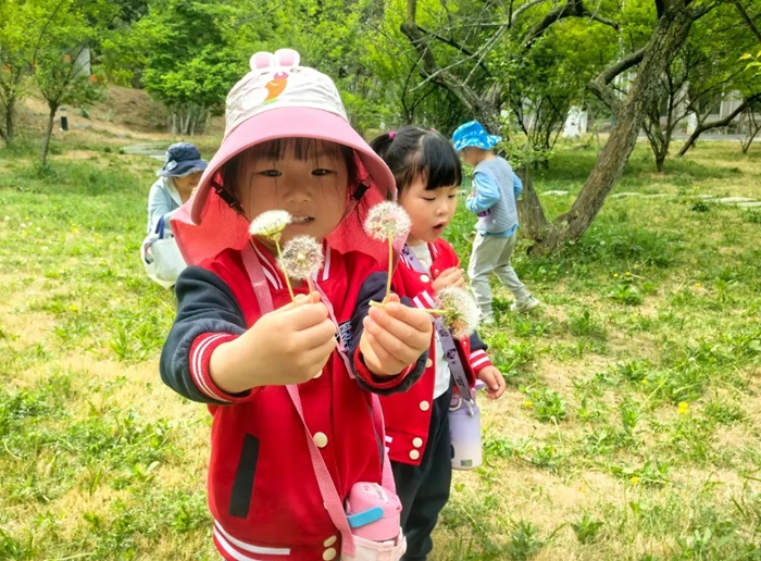 在绿草如茵的地面上,孩子们发现了大片蒲公英。他们兴奋地蹲下身来观察,并轻轻吹动这些白色的小伞兵,看着它们随风飘扬。与此同时,王姜莱妈妈邀请的绿化科时佩文老师也加入了他们的行列,为大家科普有关蒲公英的知识。孩子们听得津津有味,对大自然充满了好奇与热爱。