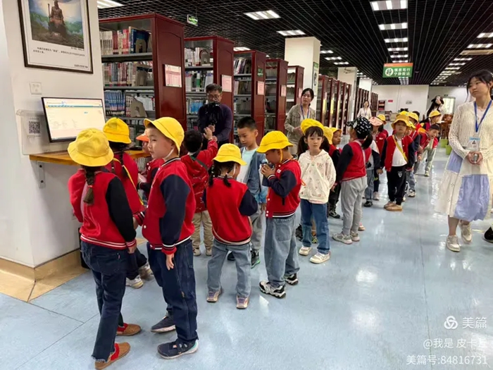 在自助借还书机前,志愿者演示了查书、借阅、归还的全流程。孩子们踊跃尝试点击屏幕,完成了一次“模拟借书”体验。通过操作资源检索系统,他们初步理解了书籍分类与编号的意义。一名工作人员表示:“让孩子们接触智能化设备,既能激发兴趣,也为未来适应小学课堂的规则意识打下基础。”