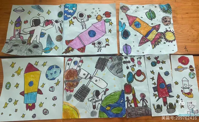 与此同时,水彩笔绘画活动也在热烈进行。小朋友们充分发挥想象力,在画纸上描绘出自己心中的太空世界。蓝色的星球、闪烁的星星、穿梭的宇宙飞船构成一幅幅充满童趣的画作。有位小朋友还在画中写道:“我长大以后也要当宇航员,去探索神秘的太空!”
