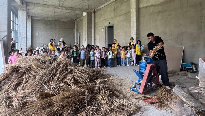 随后,小朋友们兵分两路,踏上不同的农耕体验之旅。在朝阳楼一楼,中二班和小三班的小朋友们带着满满的好奇围在志愿者身边,聚精会神地观看打小麦过程。志愿者们一边熟练操作脱粒机,一边生动讲解:瞧!小麦宝宝要从麦穗妈妈的怀抱里出来啦!随着机器的运转,麦粒簌簌落下,孩子们发出阵阵惊叹,不时伸手触摸这些新鲜脱粒的 小宝贝,眼中满是新奇与兴奋。