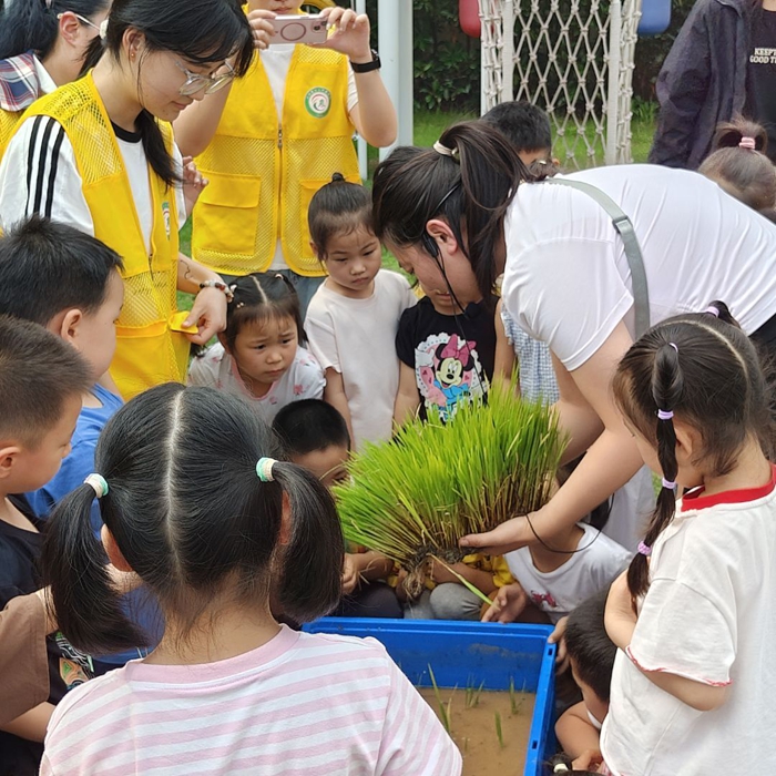 与此同时,幼儿园内的小水田边也是一片忙碌景象。中一班和中三班的小朋友们在农学院李笑笑老师、工人及志愿者的指导下,认真地学习插秧。李笑笑老师耐心示范:小手捏紧秧苗,轻轻往下插,让它们稳稳在泥土里。志愿者们手把手辅助,鼓励孩子们大胆尝试。起初还有些怯生生的小朋友,逐渐放开手脚,一株株嫩绿的秧苗在水田里整齐排列,看着自己的劳动成果,孩子们脸上洋溢着自豪的笑容。