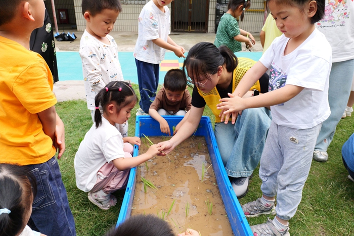 又逢“芒种”节气,脱粒机的轰鸣声中,金黄的麦粒如瀑倾泻;当幼儿园小水田泛起嫩绿的涟漪,小朋友们稚嫩的小手正将秧苗轻轻插入泥土,安农大幼儿园大学生“耕读童行”志愿活动在这充满生机的场景中火热启幕。幼儿园中班和小班的小朋友们在不同场地同时开启农耕文化探索之旅,于实践中感受传统农业的魅力与劳动的乐趣。