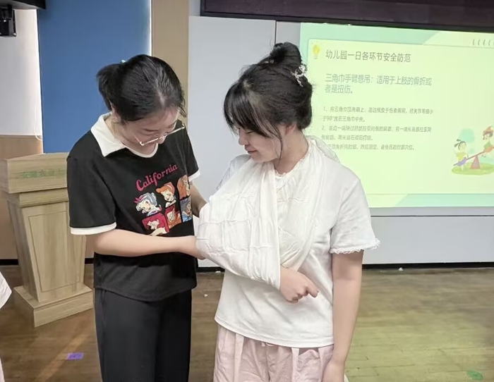 分管安全工作的副园长李晓梅围绕幼儿园发生意外事故的原因,幼儿园一日各环节安全防范,三角巾绷带的使用方法等安全教育专题进行了培训。结合幼儿园实际场景,梳理出需重点关注的安全隐患类别,引导教职工树立“预防为先”的意识。