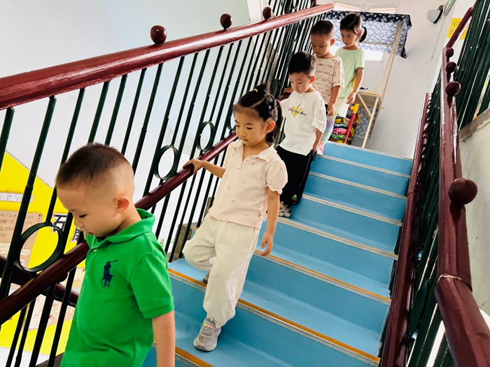 为帮助中班幼儿树立初步的安全意识,掌握基础自我保护方法,中班的教室搬到了二楼,学习怎么安全的上下楼梯,中二班、中三班“开学第一课”主题是《我会上下楼梯》。看,孩子们排着队、扶着扶手,眼睛看着脚下,走的多好呀!