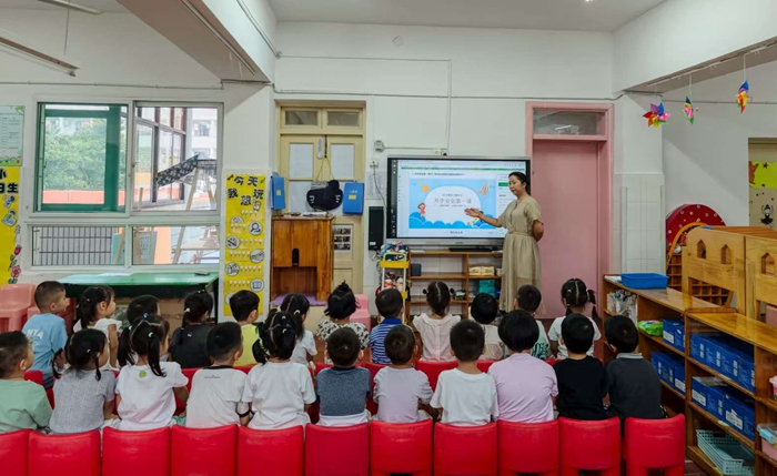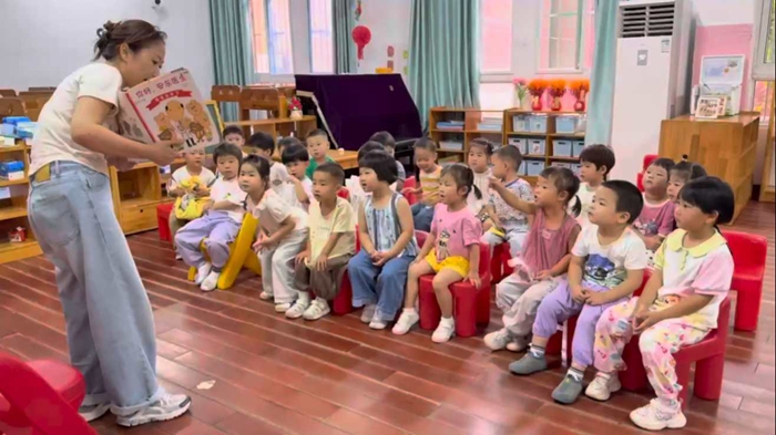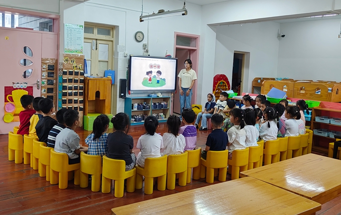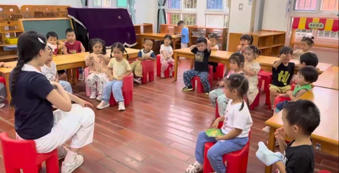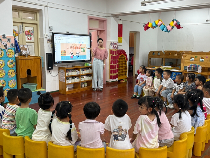 在大三班,老师组织小朋友们分享暑假经历,有人讲述去动物园看熊猫的趣事,有人分享学会游泳的喜悦,新加入的小朋友还进行自我介绍,孩子们用热烈掌声欢迎,并主动与新朋友互动玩耍,大家在欢声笑语中熟悉彼此,开启新学期。