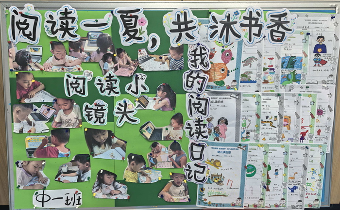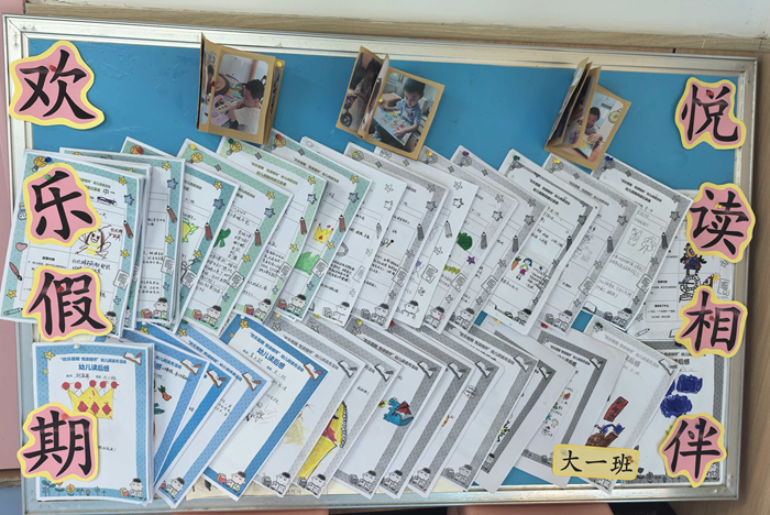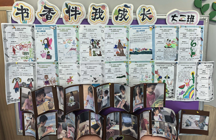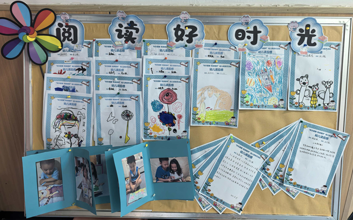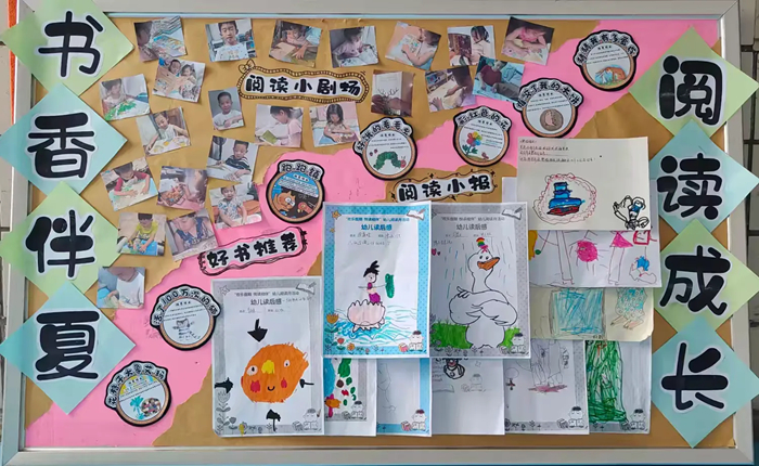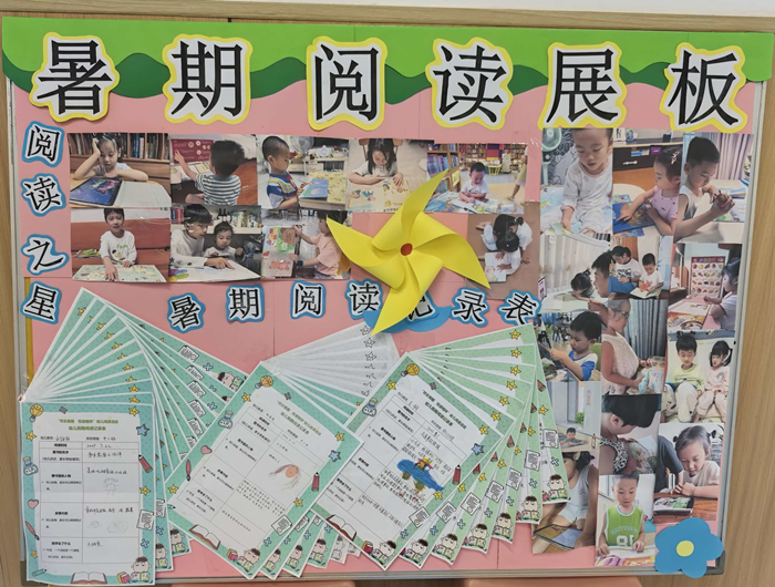 在幼儿园的门厅,各班级展出了暑期阅读活动的成果展。