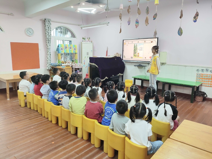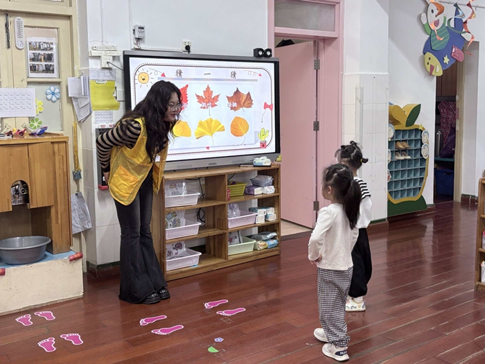 在游戏环节,哥哥姐姐们设计了“认一认”“猜一猜”等互动游戏,引导孩子们了解秋分收获的粮食和掉落的树叶,认识了不同农作物的生长特点,“秋分到,秋分到,田里庄稼笑弯腰,白天黑夜一样长,我们拍手真热闹。”活动尾声,大学生们带领全体幼儿齐唱自编的《秋分小儿歌》。朗朗上口的歌词搭配简单的手势舞,让孩子们在欢快的节奏中巩固所学知识。