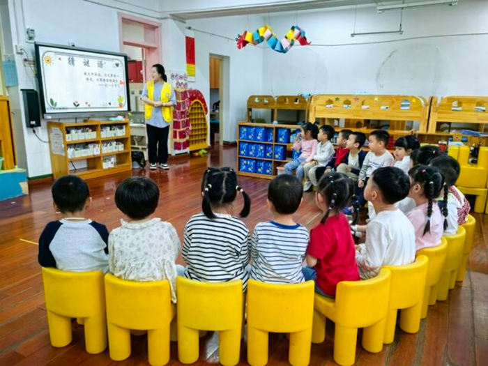 “秋分为什么叫‘秋分’?”“秋分有哪些有趣的习俗?”大学生哥哥姐姐们用有趣的谜语和绘本,为孩子们揭开秋分的秘密。他们用拟人化的语言解释节气特点:“秋分是太阳公公在天空画的一条‘平衡线’,白天和黑夜一样长,就像小朋友分蛋糕要公平一样!”用‘平衡线’‘分蛋糕’等比喻,把抽象的节气知识变得具象化,符合幼儿的认知特点。