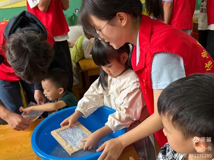 听完故事,最让孩子们期待的动手环节终于到来。哥哥姐姐们提前准备好纸浆、细帘、水盆等工具,手把手教孩子们体验造纸流程。先把纸浆轻轻搅匀,再用细帘慢慢从水里捞起来,小心不要让纸浆洒出来哦!在志愿者的耐心指导下,孩子们踮着脚尖,认真地操作着每一步。有的小朋友不小心把纸浆溅到了脸上,变成了小花猫,引得大家哈哈大笑;有的则专注地调整细帘角度,想要做出最平整的纸