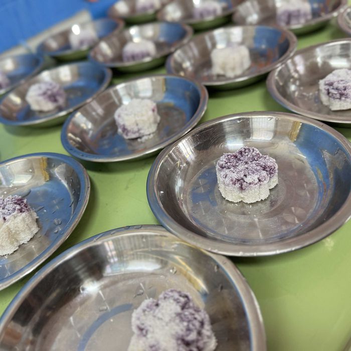今天安农大幼儿园食堂推出新品点心“紫薯山药糕”,凭借软糯的口感和丰富的营养,加上漂亮的外形,迅速成为孩子们餐盘里的“新宠”。