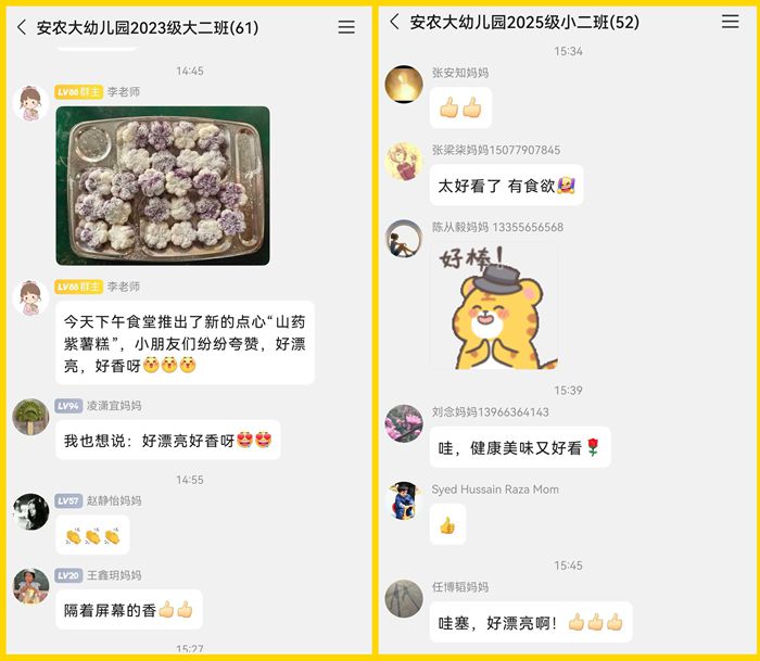 下午午点时间,“紫薯山药糕”刚端上班级幼儿的餐桌,就因紫白相间的花朵颜值引发孩子们的兴趣。不少孩子主动拿起糕点品尝,纷纷表示“香香的、软软的,很好吃”。班级老师们及时将新推出的午点分享到家长群里,获得家长点赞,幼儿园在饮食上想办法,既解决了孩子挑食的问题,又保证了营养,让家长放心。