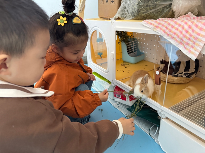最近中三班来了一位新朋友,是我们的萌宠:垂耳兔—小小。姬老师借此机会,向孩子们科普了科学喂养兔子的知识。他纠正了兔子只吃胡萝卜的常见误区,强调干草、兔粮和清水才是它们健康饮食的基础,过多的蔬菜水果反而会让小兔子生病。