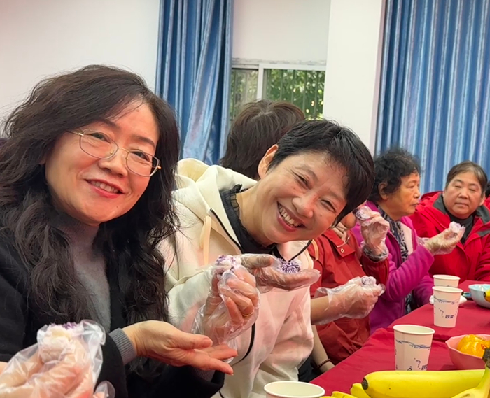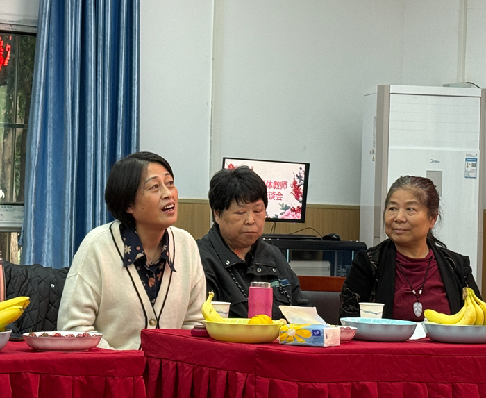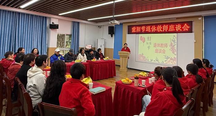 座谈会现场处处洋溢着温情:党支部提前精心布置会场,门厅里摆放着欢迎回家”的展板,空气中飘着刚煮好的菊花茶与重阳糕的香气。退休老师刚踏入会场,便被满场的用心打动。