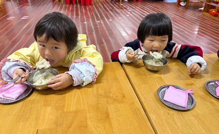 用餐时间,热气腾腾的水饺端上餐桌,孩子们早已迫不及待。他们一手扶碗、一手拿勺,小心翼翼地舀起水饺,吹一吹热气便大口品尝起来。“这个水饺有芹菜的香味,还有肉肉!”“香干脆脆的,好好吃!”孩子们一边品尝,一边兴奋地分享着自己的感受,小脸上满是满足与幸福。老师们还趁机向孩子们讲述立冬吃水饺的民俗传说,科普芹菜、香干、鲜肉的营养功效,让孩子们在味蕾满足的同时,收获知识与文化启蒙。