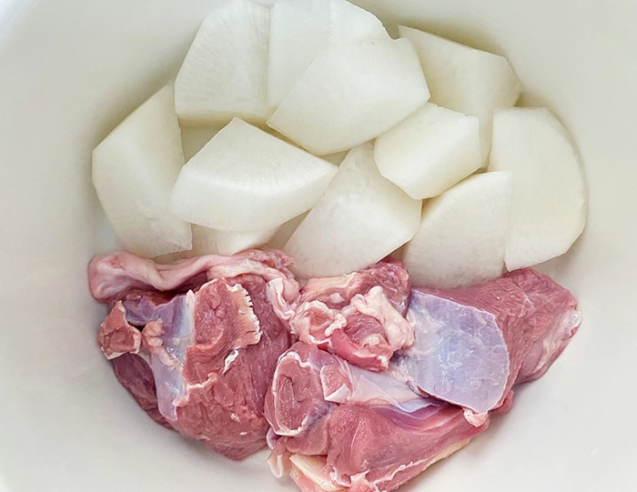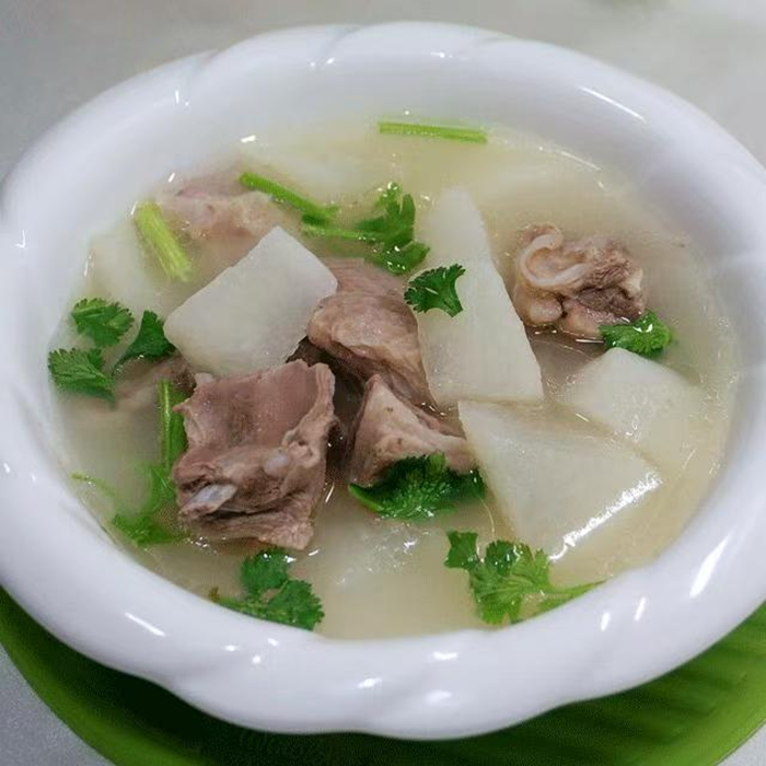 羊肉性温味甘,能温中散寒、益气补虚,是冬日滋补的佳品;萝卜清热生津、消食化积,与羊肉搭配不仅能中和油腻,更能健脾养胃,尤其适合幼儿娇嫩的肠胃。为保障食品安全与口感,幼儿园食堂严格筛选新鲜优质的羊肉,剔除筋膜后切成小块焯水去血沫,搭配清甜多汁的白萝卜慢火熬煮。烹饪过程中不添加任何辛辣调味品,仅以少量姜片去腥、食盐提鲜,确保汤汁鲜香醇厚、营养不流失,符合幼儿饮食清淡、易消化的需求。